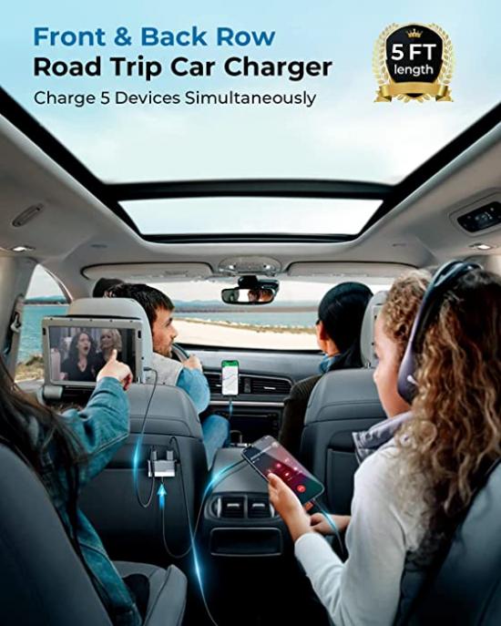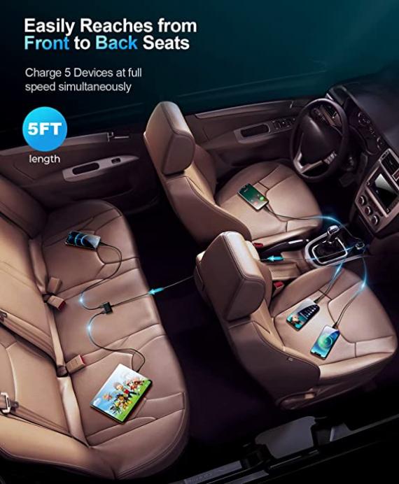 - 🎁Traveling & Family Car Charger: Tollefe 5 multi-port car charger designed for multi-charging needs USB port for car. 3 cigarette lighter USB for driver seat passengers, 2 car charging ports for rear seat passengers. The 5 FT durable extension cable design, allows all passengers could charge their electronic devices simultaneously. Get one for your upcoming family trip or give it as a decent gift for someone you care about.