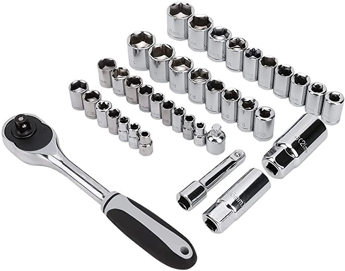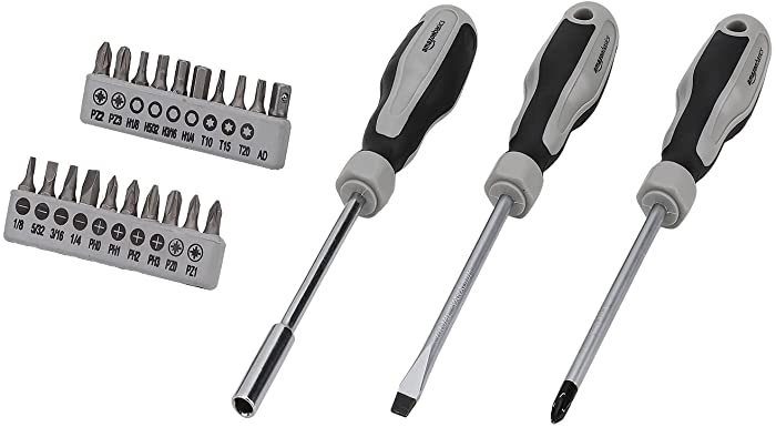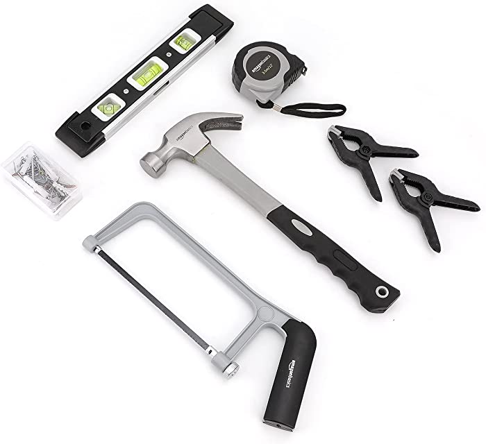 DescriptionProduct DescriptionThe 173-Piece General Household Hand Tool Set includes: *8pcs combination wrenches: 10mm,12mm,13mm,14mm,3/8 inch,7/16 inch,1/2 inch,9/16 inch *22pcs hex keys: 1.27mm, 1.5mm, 2mm, 2.5mm, 3mm, 3.5mm, 4mm, 4.5mm, 5mm, 5.5mm, 6mm, 0.05 inch, 1/16 inch, 5/64 inch, 3/32 inch, 7/64 inch, 1/8 inch, 9/64 inch, 5/32 inch, 3/16 inch, 7/32 inch, 1/4 inch *1pc 6-inch slip-joint pliers, *1pc 6-inch long nose pliers, *2pcs screwdrivers:SL1/4 x4 inch, PH2x4 inch *1pc 6.35mm bits holder, *70pcs fasteners, *1pc 12FT measuring tape, *1pc 18mm utility cutter, *1pc 9-inch torpedo level, *1pc 8-inch water pump pliers, *1pc 6-inch wire strippers, *1pc 8oz claw hammer, *2pcs 3-inch clamps, *1pc 6-inch hand saw, *20pcs bits, SL1/8,5/32,3/16,1/4; PH0,1,2,3,PZ0,1; PZ2,3,H1/8,5/32,3/16,1/4; T10,15,20,adaptor *1pc 3/8-inch ratchet wrench, *1pc extension bar, 3/8 inch to 3 inch *2pcs 3/8-inch spark plugs:5/8 inch, 13/16 inch *1pc adaptor, 1/4 inch(male) to 3/8 inch (female) *16pcs 1/4-inch sockets: 5mm,6mm,7mm,8mm,9mm,10mm,11mm,12mm,13mm,3/16 inch,7/32 inch,1/4 inch,5/16 inch,3/8 inch,7/16 inch,1/2 inch *18pcs 3/8-inch sockets:8mm,9mm,10mm,11mm,12mm,13mm,14mm,15mm,17mm,19mm, 5/16 inch,3/8 inch,7/16 inch,1/2 inch,9/16 inch,5/8 inch,11/16 inch,3/4 inch From the ManufacturerAmazon Basics Product information