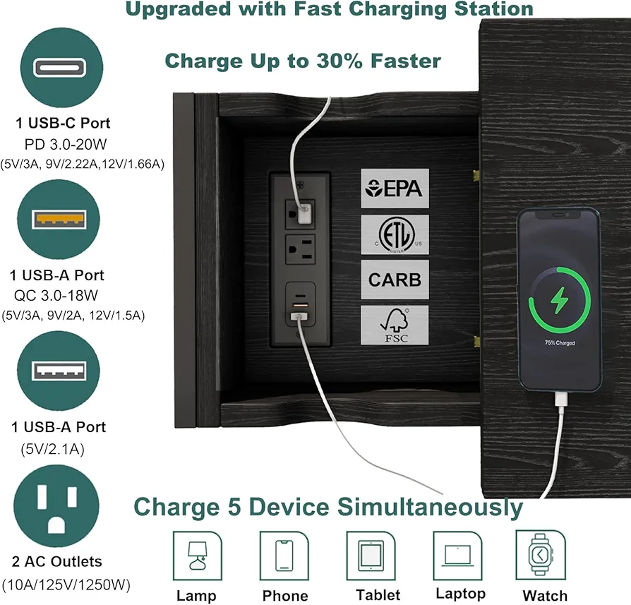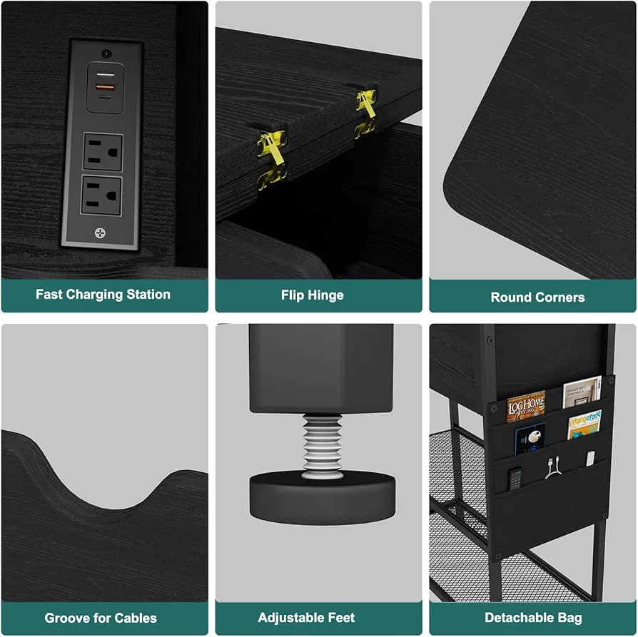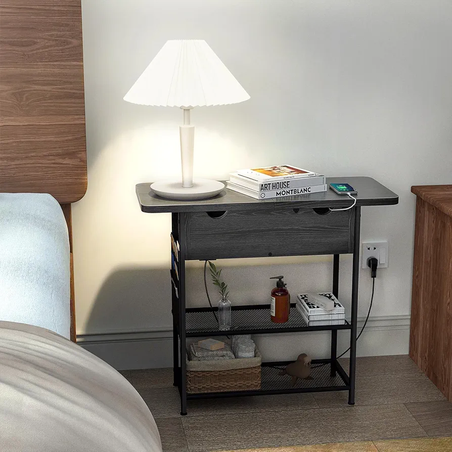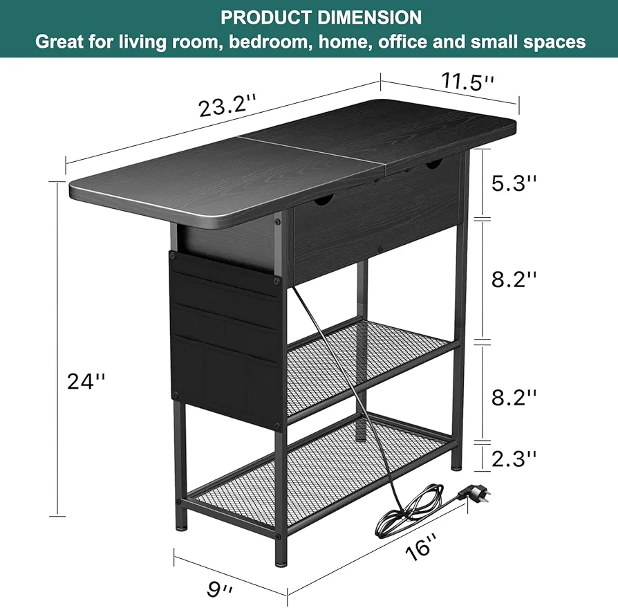 End Table with Fast Charging Station, Narrow Side Table with USB C Ports and Outlets,Flip Top Bedside Table, Nightstand with Drawers for Living Room Bedroom and Small Space (Deep Black)