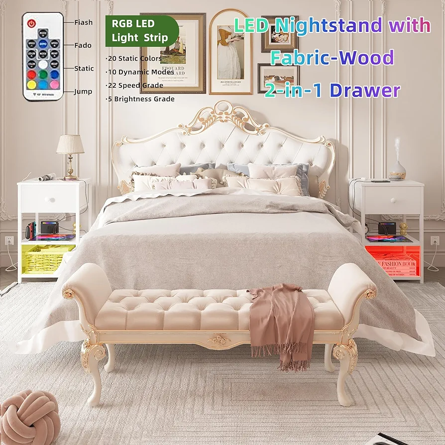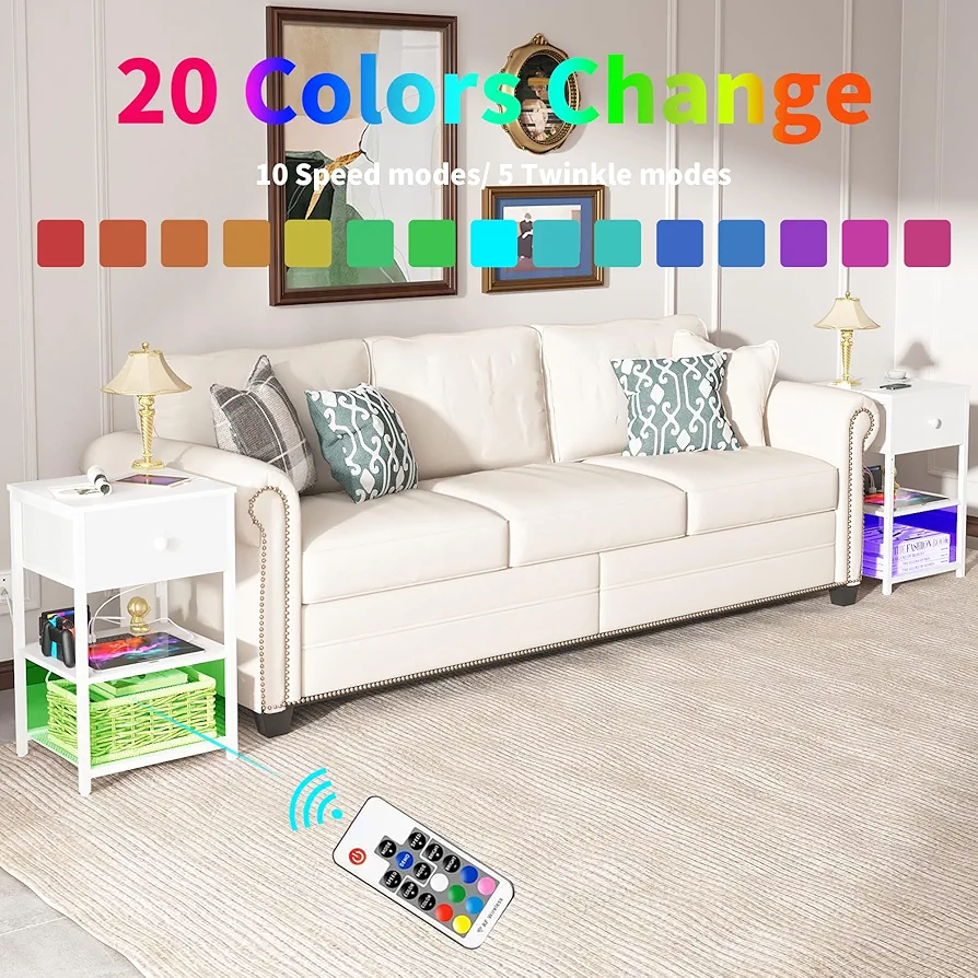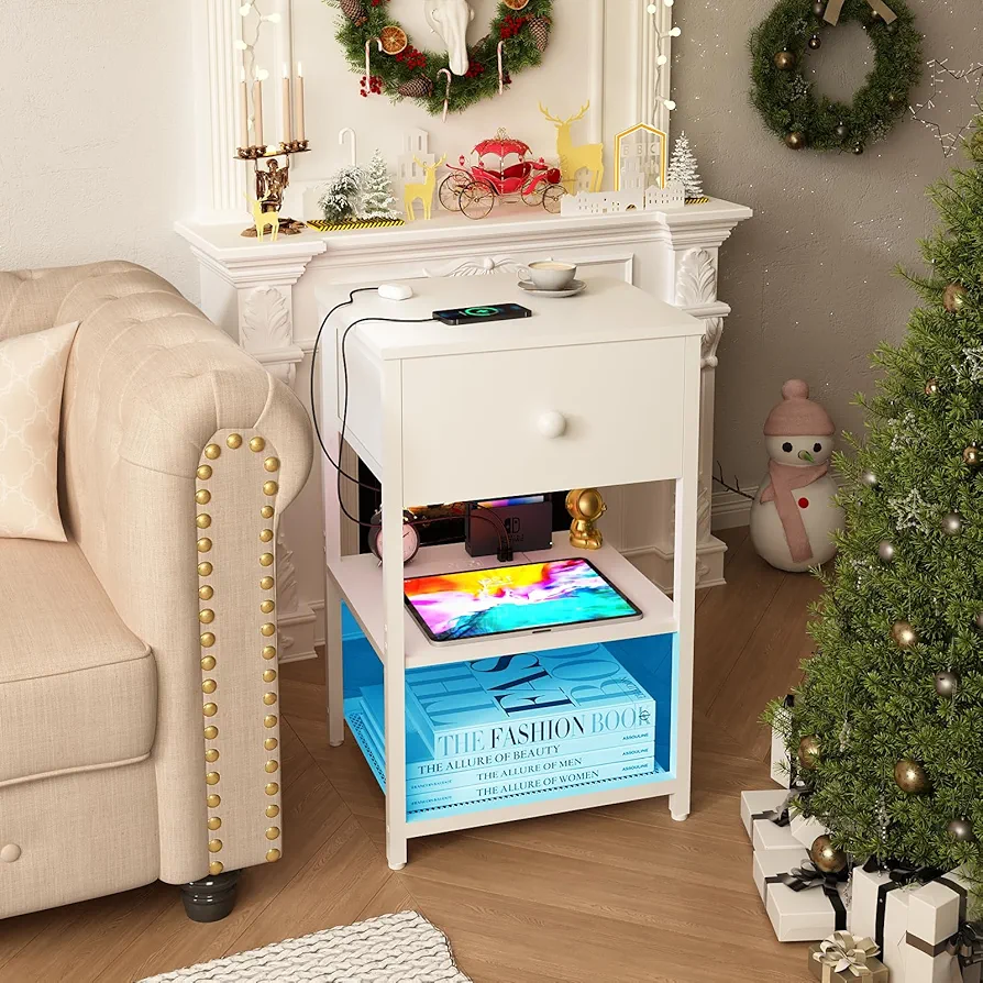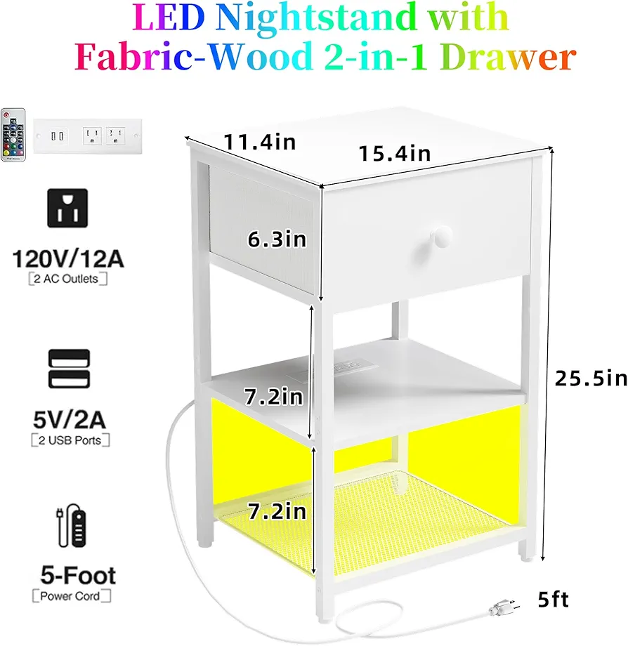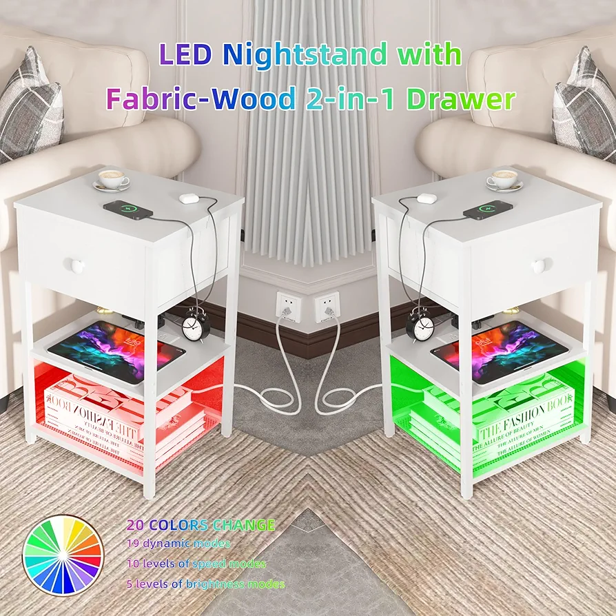 LED Nightstands Set of 2 with Charging Station, Bedside Tables with USB Ports and Outlets, End Table with Fabric-Wood 2-in-1 Drawer, White Side Table for Bedroom, Living Room