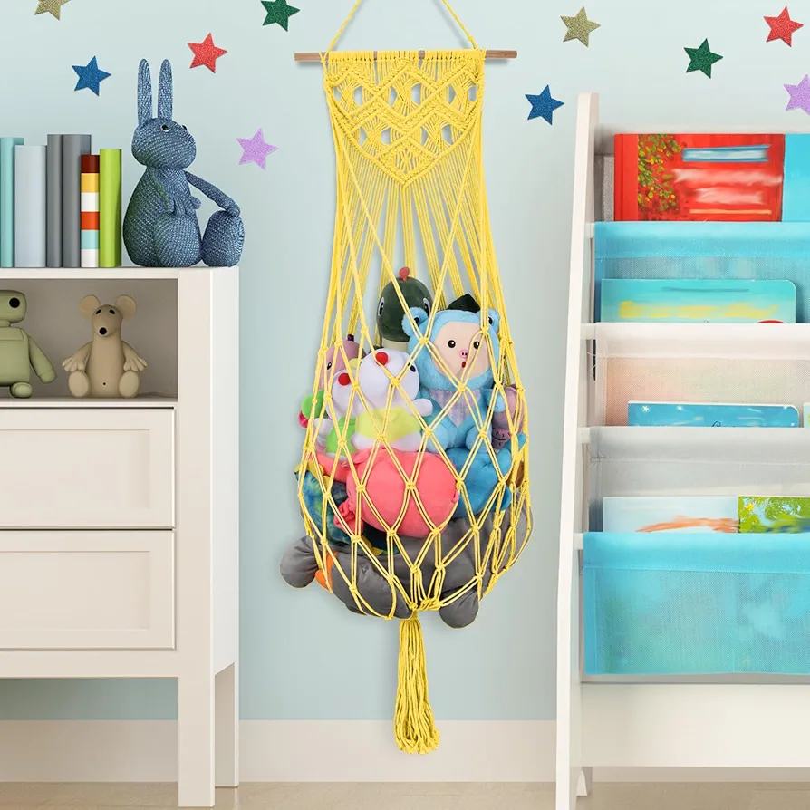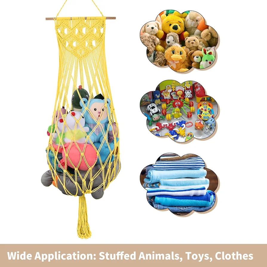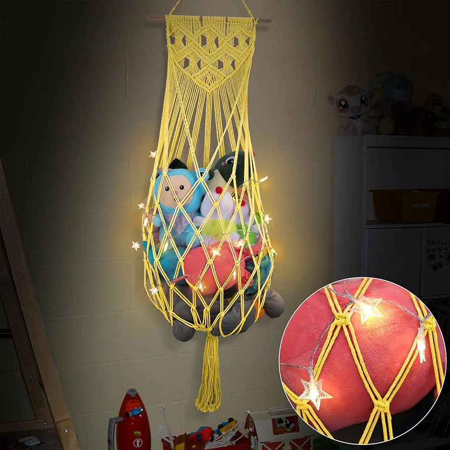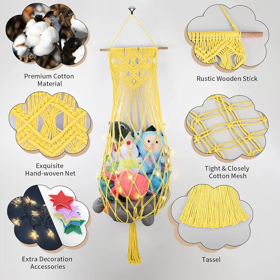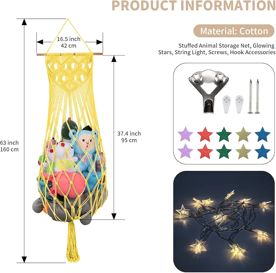 Stuffed Animal Hammock Corner, 56 Inch Jumbo Macrame Ceiling Toys Net, Light Yellow Wall Hanging Organizer Holder Plush Storage Display Net Mesh with String Light for Nursery Playroom Kid Room Decor