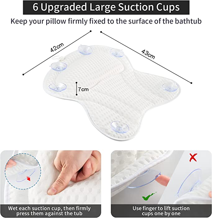 🛀Six suction cups. Other pillows have 3 or 4 suction cups, but our product has 6 which can be firmly fixed to the bathtub.